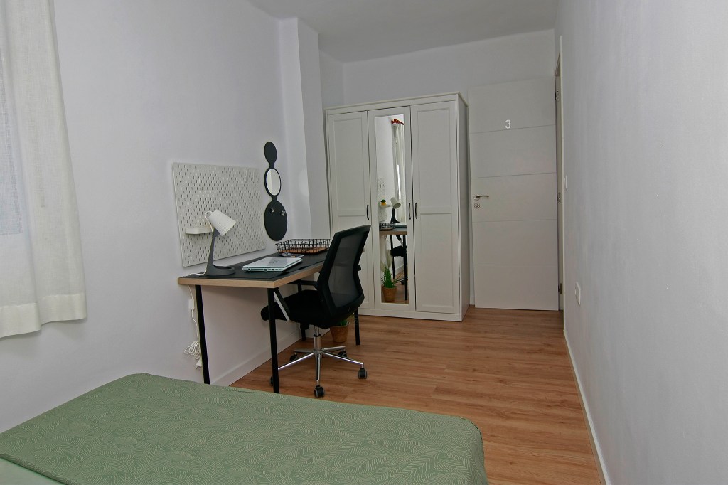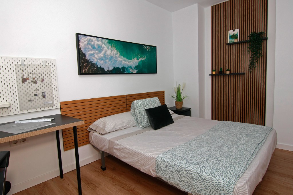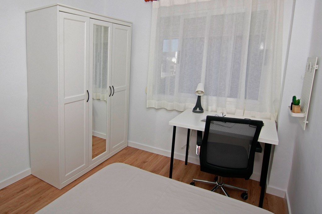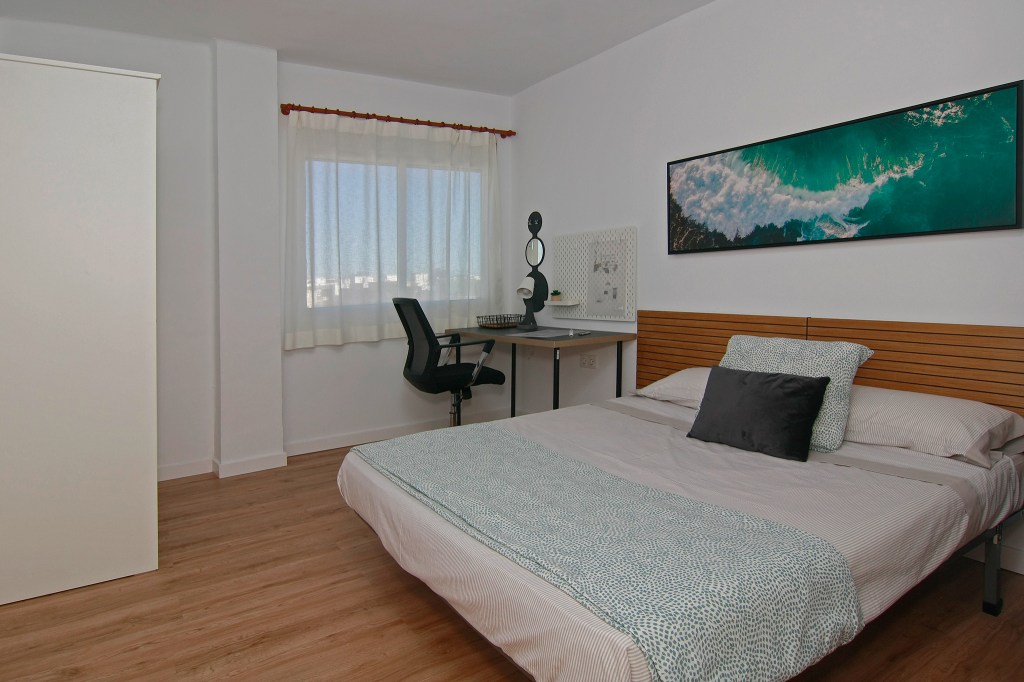 Esta habitación cuenta con una cama de matrimonio perfecta para un descanso tranquilo, un escritorio de estudio para tus tareas académicas, un amplio armario para mantener tus pertenencias organizadas y una ventana que aporta luz natural a tu espacio.